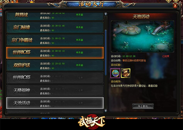 犹记得很多古装剧的男女主角都是缘起于“洗澡”,往往都是男主不小心偷看到美若天仙的女子在池中嬉戏,结果互生情愫定下今世良缘。而在《武极天下》里,天池不仅是结识有缘人的圣地,更是获取海量经验轻松升级的最佳渠道!60级以上的玩家每天可以在12:00—12:30期间,通过【活动大厅】进入天池,吸取天地之灵气,从而对全身心进行放松。