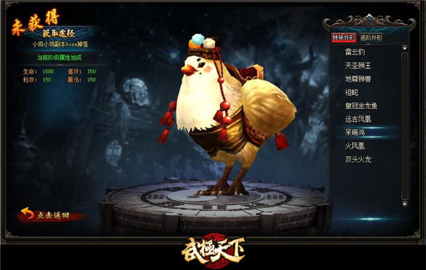 在武林世界征战,当然少不了一匹得力的坐骑,在《武极天下》中即是契约兽。《武极天下》中的契约兽已有众多,如嗜血战狼、泗水麒麟、幽冥巨象、紫极雷兽等17种类型。但这些炫酷霸气的坐骑难免会有一些“萌妹子”或“软兄弟”不喜欢,所以全新的“呆萌鸡”上线!此鸡不仅是玩家驰骋天衍大陆的腿脚,它还可以学习战斗技能,给对手造成致命伤害。通过培养还可以使它的攻击技能更强,跟玩家给技能升级是一个道理!