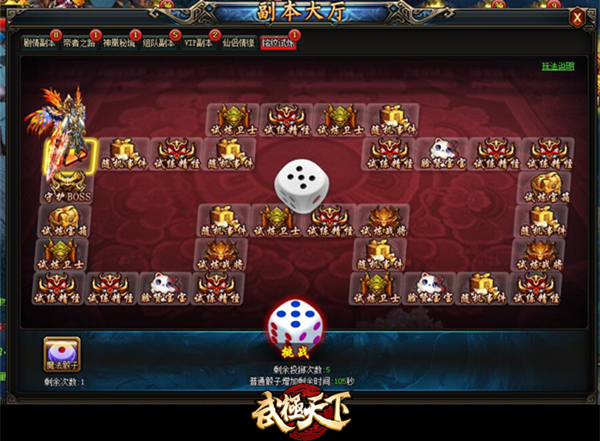 眼尖的朋友不难发现,在大骰子旁边有一个紫色方框内写着“魔法骰子”,使用它就可以决定你想要走的步数,这感觉完全是在开挂啊~但是有个前提,必需得随着普通骰子一起使用才能达到决定步数的效果,如果先前已经将普通骰子用尽,再次点击魔法骰子会自动进入铭纹试练副本。铭纹试练副本一共有9关,每关镇压着一个BOSS,由简至难,玩家需要积攒足够的实力才能挑战BOSS获得更丰富的奖励。