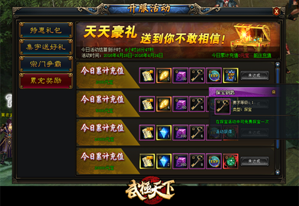 2.新服玩家完成37级主线任务后会开启【开服活动】,在活动时间内累计充值到一定额度,就可以获得探宝钥匙,充值金额越高,所获得的钥匙就越多。