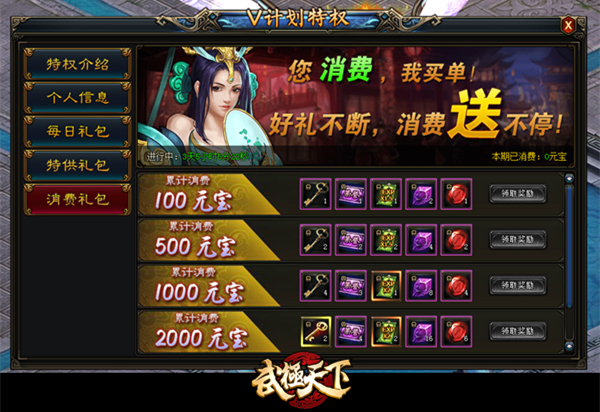 4.消费礼包:玩家在游戏中消费元宝,随着额度的增加,所能获得的探宝钥匙也会越来越多;传说中的秘藏钥匙只要累积消费2000元宝、5000元宝就能获得,所有充值都是累计,但奖励绝对不累计!玩家完成消费后再通过【V计划—消费礼包】进入领取奖励即可。