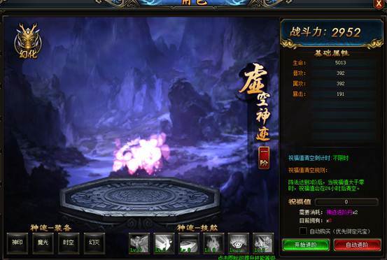 a.点击【角色】-【神迹】可打开系统面板,通过消耗【神迹进阶丹】可提升祝福值,祝福值满则进阶至下一阶阵法,同时可获得酷炫造型和海量人物附加属性;