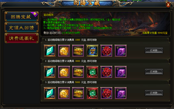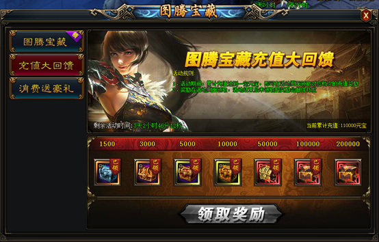 1、活动期间累计充值达到一定元宝,即可在活动页面领取对应档次的充值奖励
