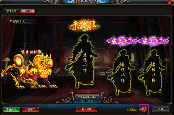 d奖励内容:称号,坐骑,每日领取礼包,都和现在本服宗门战的规则一样,也可在左下角“奖励展示”查看;