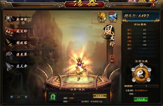 消耗一定的法器碎片即可给相对应的法器铸魂,祝福值满后可点亮一个注魂阶段,点亮五个注魂阶段即可进入下一阶。注魂升阶可带来大量的属性及战力哦,快来行动吧!