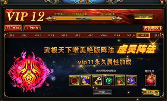 1、VIP奖励优化,VIP10增加武缘圣美圣器-【圣典】,VIP11增加全新永久阵法【虚灵阵法】,已经领取过对应奖励的玩家们不用担心,我们会将截止到7月1日维护时已达到vip10以上的玩家进行统计,统一补发道具。