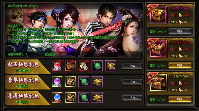 2. 新增活动【仙缘下凡】,每次充值达到相应额度即可领取积分奖励,还有超值封印宝箱,直接开出整张武缘,所有最强力的武缘都在这里了!