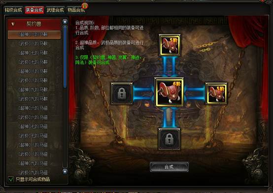 ② 装备合成系统,去除了原本的合成符机制,调整为二件等阶、品质一样的装备即可合成一个更高阶的装备。
