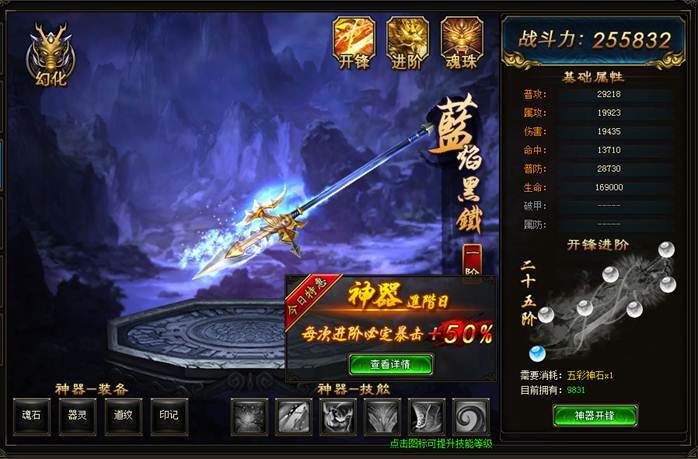 1. 新增神器【开锋】系统,点击【开锋】就可切换进阶状态,消耗【五彩神石】即可提升神器开锋等阶!每日限购,机不可失哦~