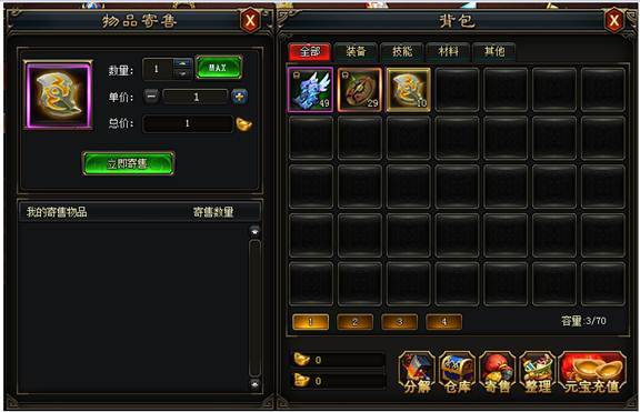 3、点击【立即寄售】 按钮,即可将该物品挂到寄售行上。其它玩家即可通过寄售行查看、购买你的物品了。
