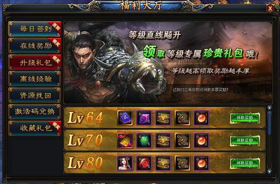 只要达到指定等级,就可以在福利界面领取等级礼包一份,等级越高,奖励越丰厚!